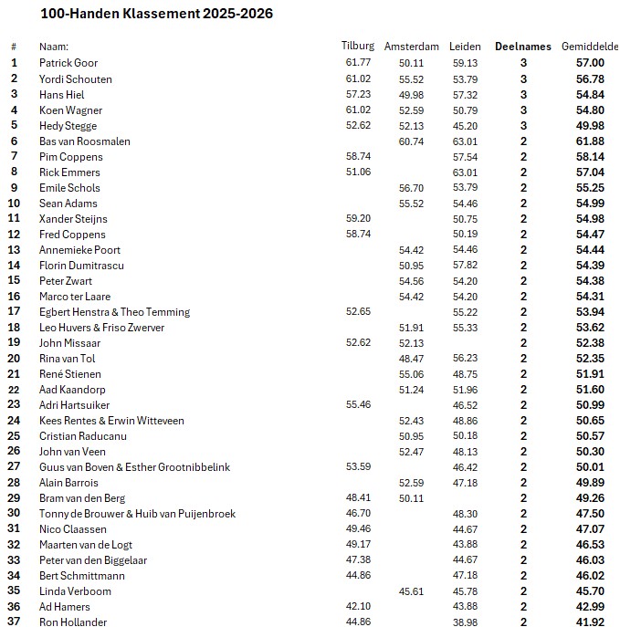 Over alle 100-Handen Drives wordt een klassement opgemaakt.